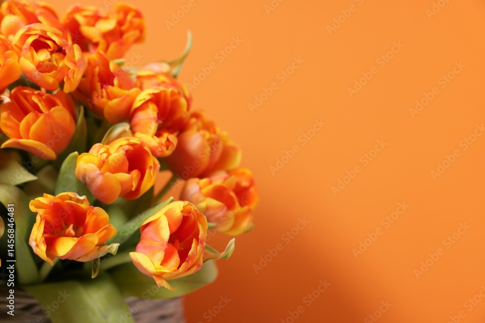 Plakat - Beautiful tulips on orange background, closeup. Space for text.