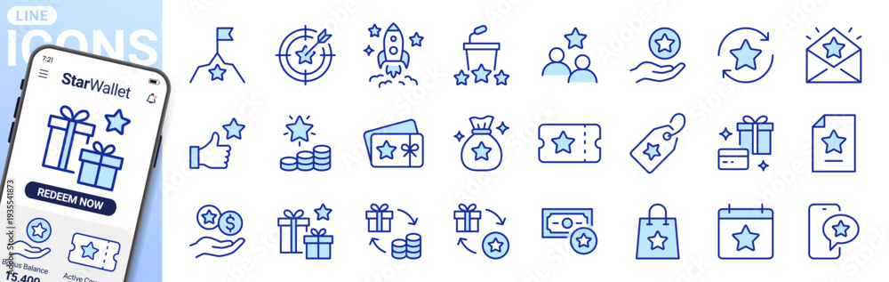 >Plakaty>Wybrane motywy - zobacz więcej !>Rafa koralowa>Reward and loyalty program icon set with stars, gifts, rocket, achievements. Success symbols for customer recognition, bonus points, goal targeting, membership benefits. Blue duotone line vector