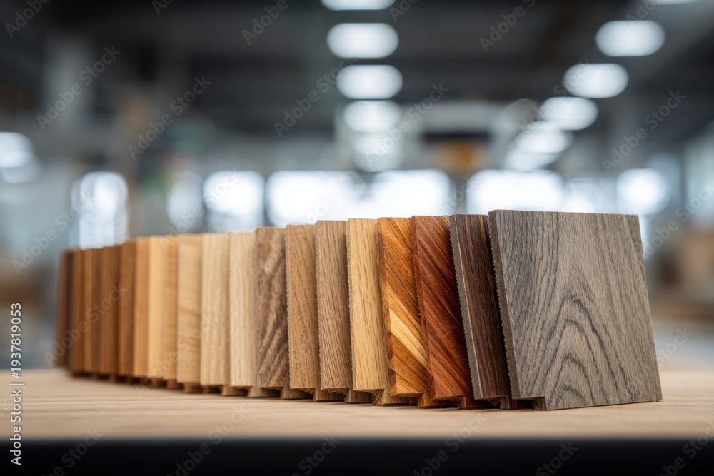 Plakat - Diverse wood samples displayed in a row, showcasing various grains and colors in a workshop.