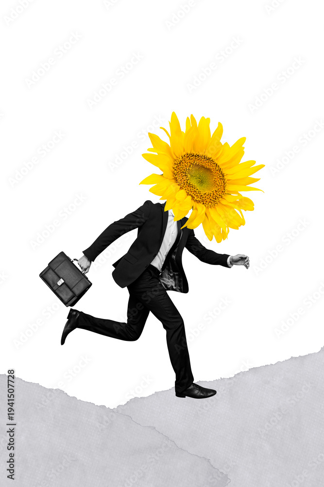 Plakat - Vertical photo collage of anonym guy run instead head sunflower late meeting wear formal suit carry briefcase isolated on painted background.