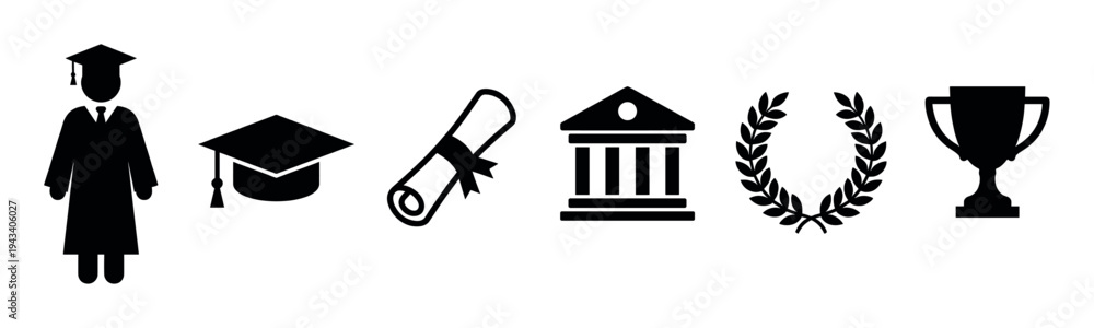 >Plakaty>Wybrane motywy - zobacz więcej !>Rafa koralowa>Set of black graduation icons including a graduate, mortarboard cap, diploma scroll, university building, laurel wreath, and trophy cup in a simple graphic style