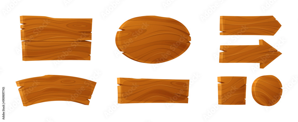 Plakat - Rustic wooden signboard set with vintage plank frames and cartoon arrow pointers. Vector game board collection of farm sign panels, 3d banners, old west saloon designs and blank label templates..
