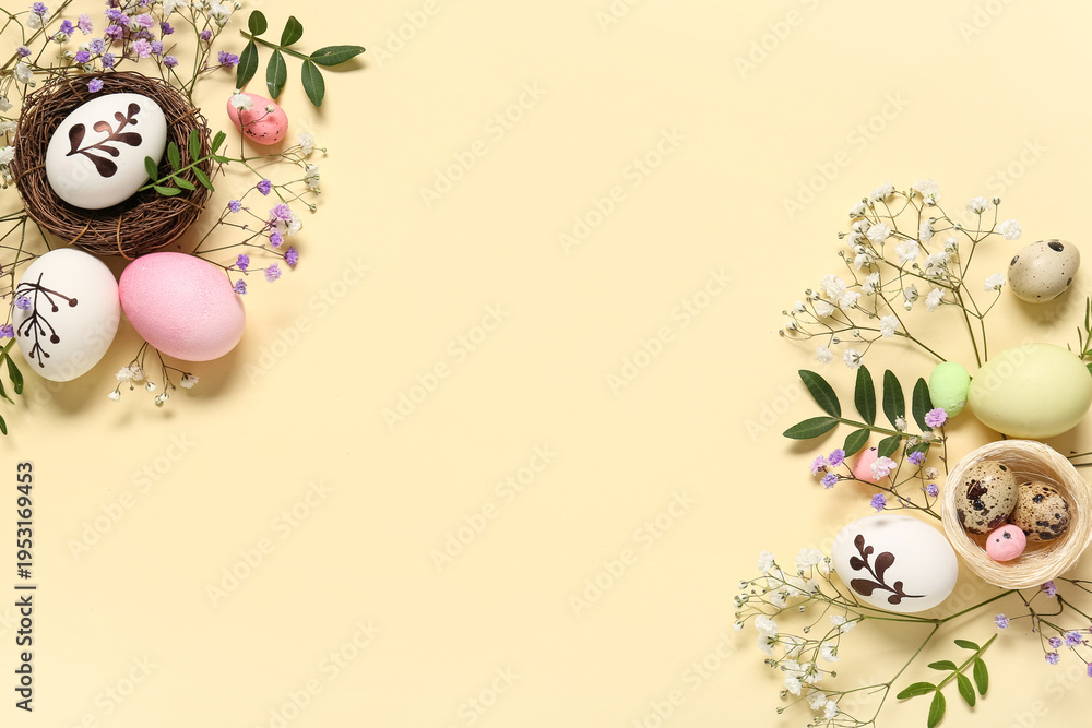 Plakat - Easter eggs with beautiful gypsophila flowers and leaves on beige background.