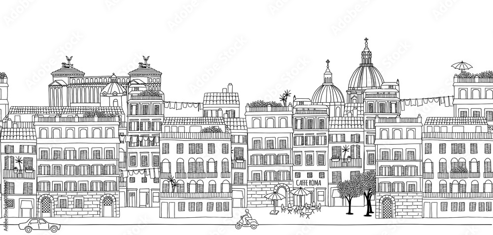 Plakat - Seamless banner of Rome's skyline, hand drawn black and white illustration.