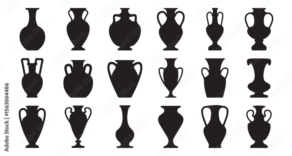 Plakat - Vector set silhouettes of ancient amphorae and vases. Greece icon collection. Classic Vase Silhouettes set of black silhouette vases, in various styles, Isolated illustration on white background.