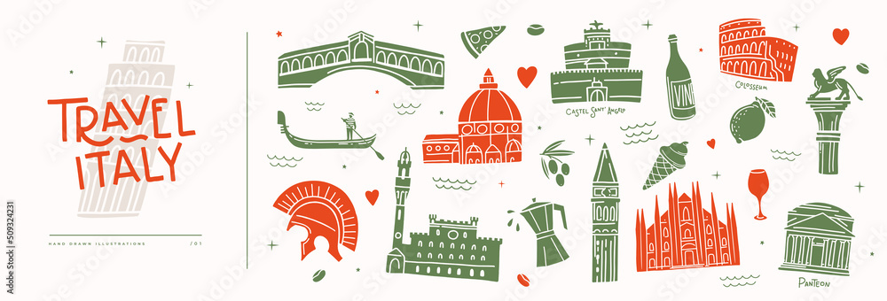 >Plakaty>Wybrane motywy - zobacz więcej !>Rzym>Large set of popular symbols of Italy. Decorative images: Colosseum, gondolier, legionnaire's helmet, bridge in Venice, basilicas and fortresses, St. Mark's column. Vector illustration isolated.
