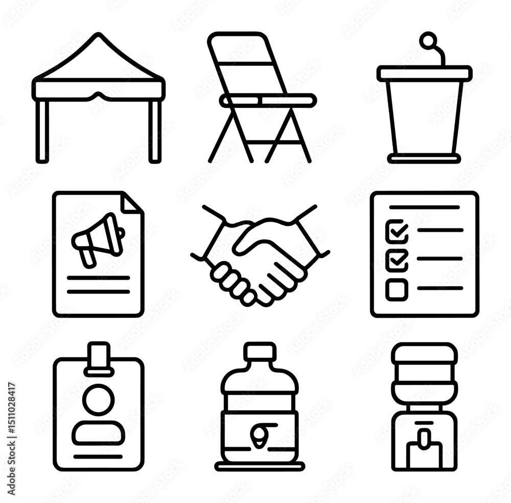 Plakat - Community Events Icon Set. Outline icon set of community organizing events: community tent, folding chair, microphone podium,.