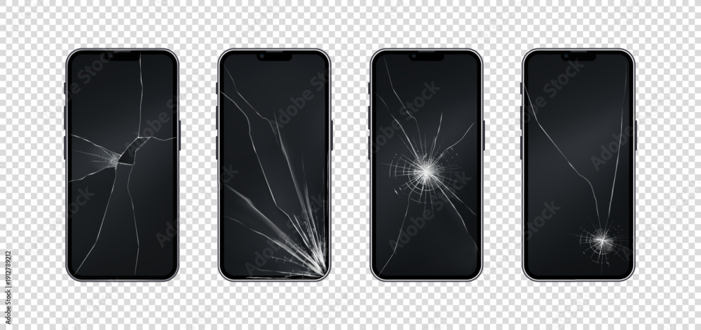 Plakat - Phone with broken glass. Mobile cellular device. Realistic screen crack. Smartphone repair service. Plexiglass display fix. Electronic gadget. 3D telephone touchscreen. Vector damaged cellphone set.