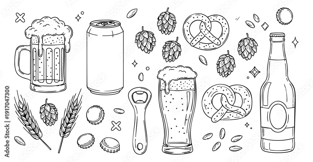 >Plakaty>Wybrane motywy - zobacz więcej !>Samochody>Hand drawn line art beer set featuring mugs, glasses, bottles, cans, pretzels, hops, wheat, and a bottle opener for brewery designs and celebrations