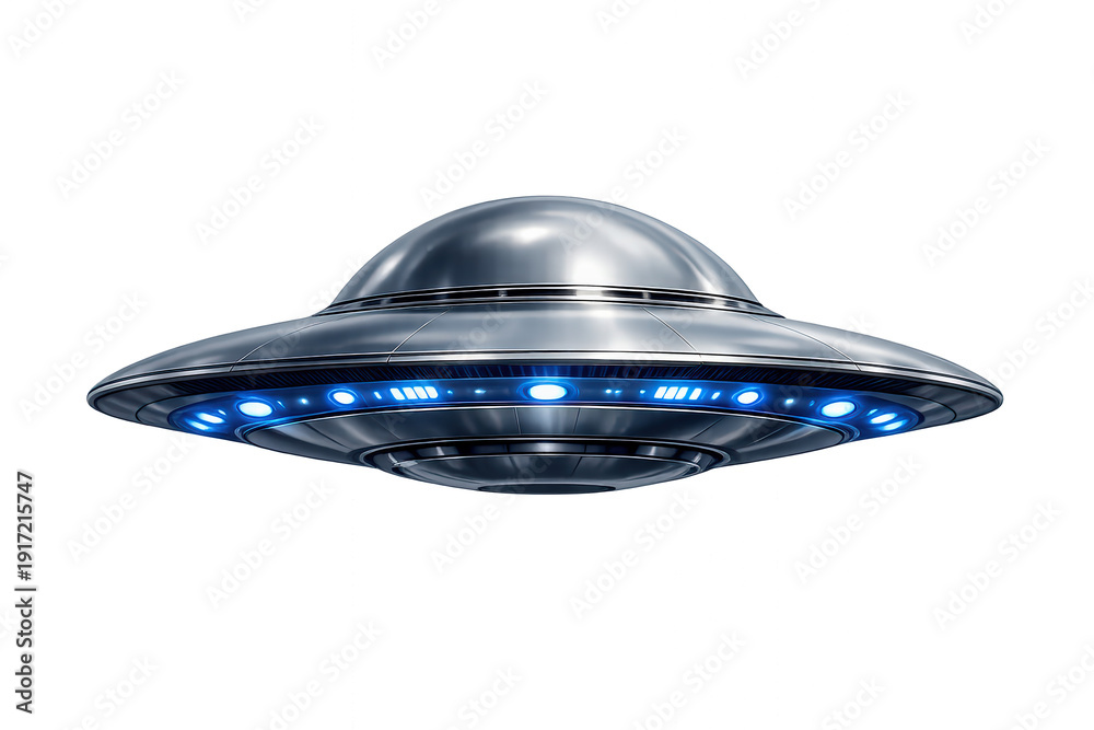 Plakat - Shiny gray ufo spaceship generating blue lights, representing alien life, invasion, space travel, and cosmic mystery, transparent background.
