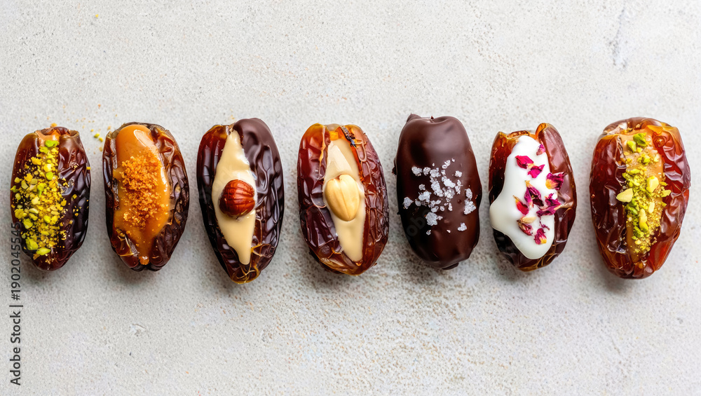 Plakat - Assorted Stuffed Dates with Various Toppings on Neutral Background for Culinary and Food Photography , stuffed dates, date snickers, nut butter filling, healthy dessert, no bake sweet, bite size treat.