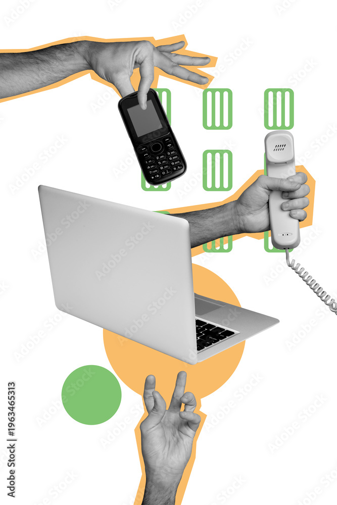 Plakat - Vertical photo collage of hands business cal center workers hold laptop mobile telephone handset rare service isolated on painted background.